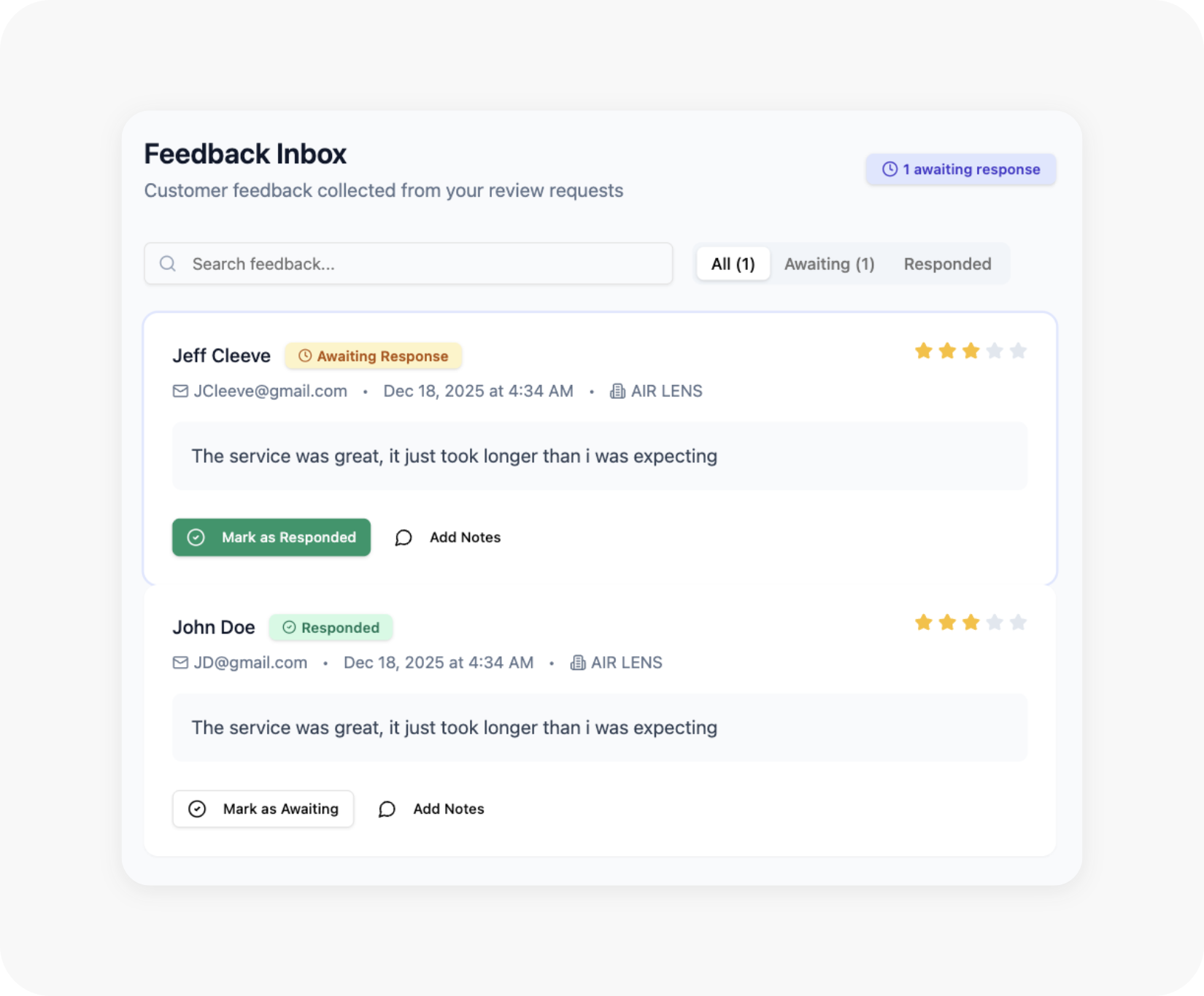A dedicated inbox in our platform that allows you to contact customers to learn what went wrong and respond to rectify any issues.